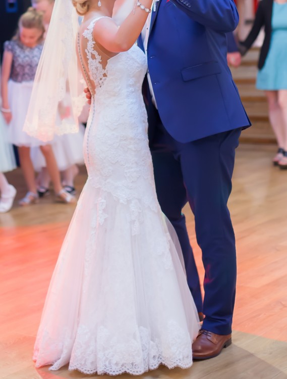 Suknia użyta raz w dniu ślubu, bez sesji plenerowej.