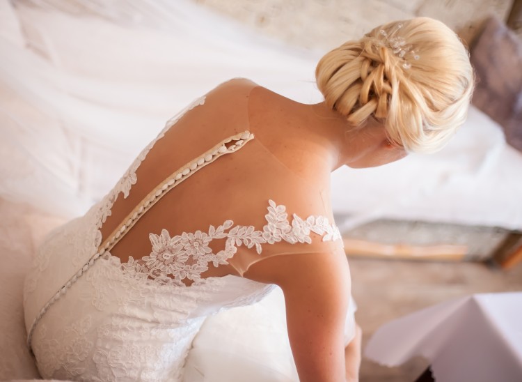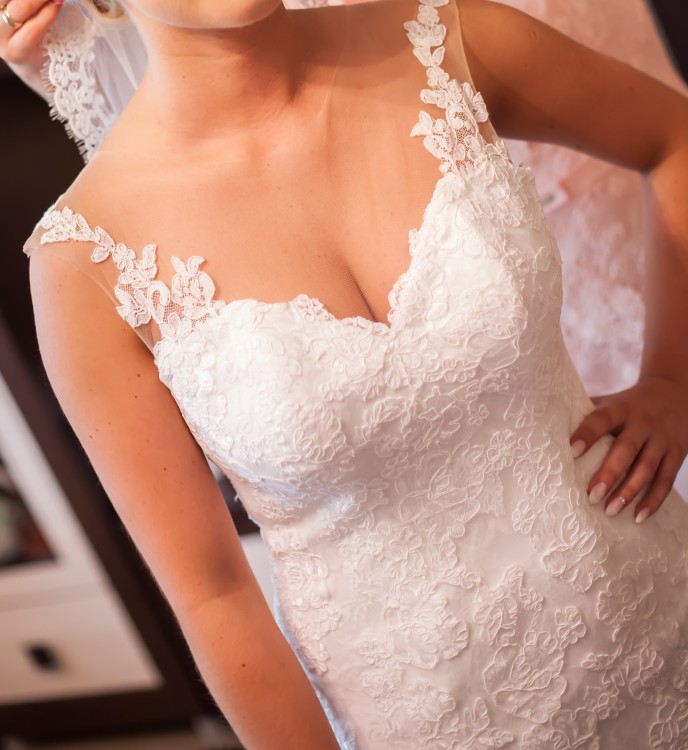 Sukienka ma wycięcie do połowy pleców. Cała jest obszyta koronką, ale największe wrażenie robią elementy, które sprzyjają wyeksponowaniu jej na tle skóry – koronkowe ramiączka, piękne obszycie dekoltu o linii serca