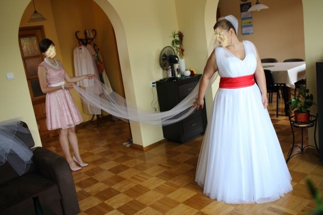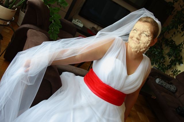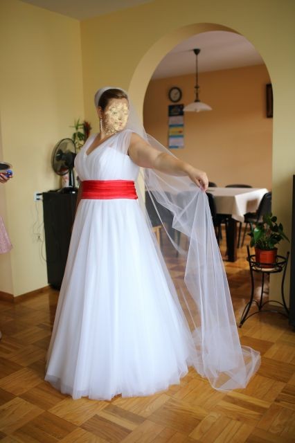 Suknia jest z tiulu w kolorze śnieżno-białym z czerwonym pasem ( który był dopasowany kolorem do czerwonych butów z firmy Gabor - polecam, bardzo wygodne), (który za pewne każda krawcowa jest w stanie wymienić na inny).