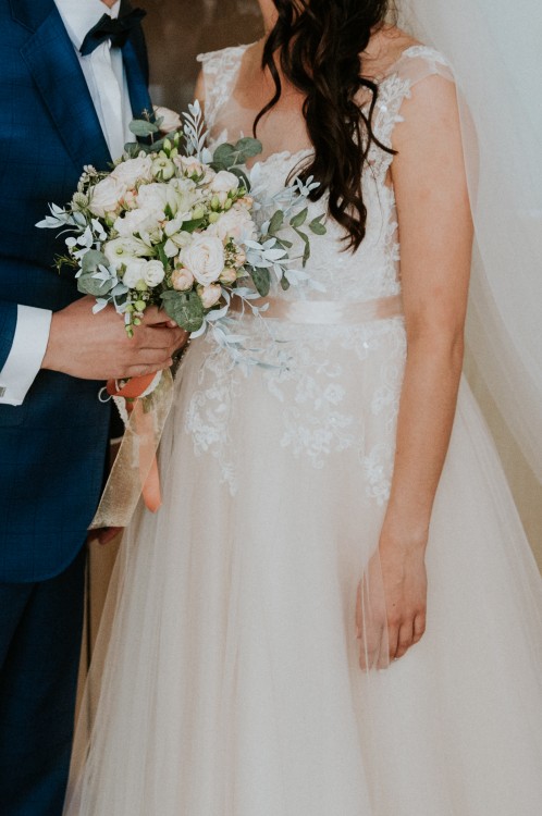 Sprzedam suknie ślubną, która została uszyta na wzrost 164 + obcas 9cm. Suknia bez koła dzięki temu układa się naturalnie i zwiewnie. Pięknie układa się w tańcu.