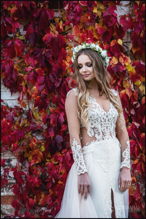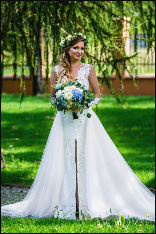 Suknia uszyta została na miarę w pracowni sukien ślubnych w roku 2017 (marzec-sierpień).