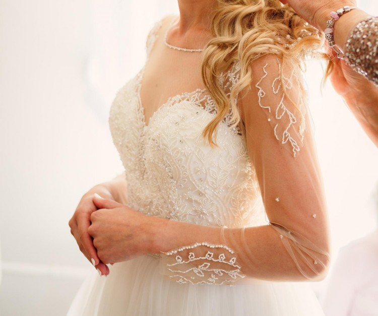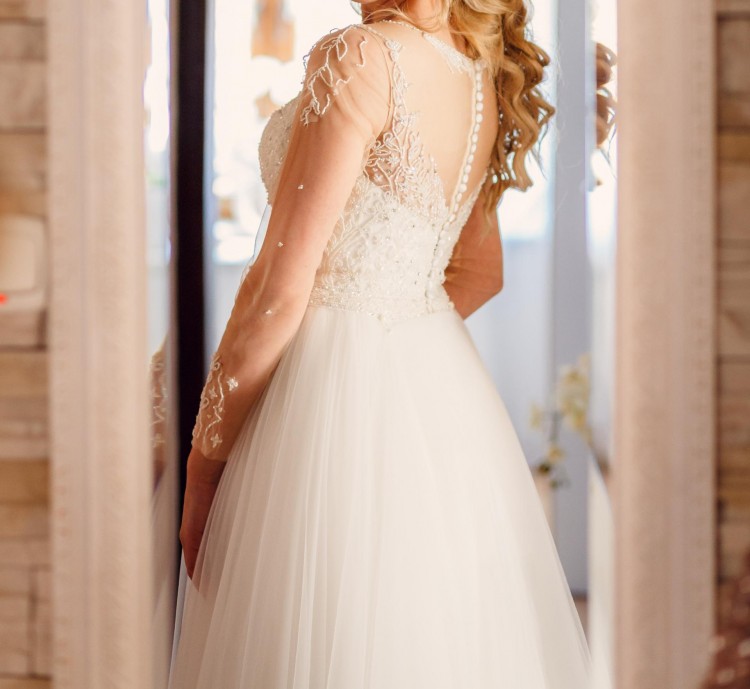 Suknia ta jest wyjątkowa z tego względu że posiada doszyte długie rękawy, które w każdej chwili można odpruć i suknia wraca do swojego pierwszego oryginalnego stanu.