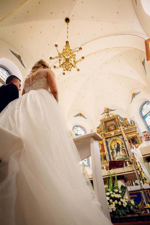 Góra sukni zdobiona kamieniami Swarovskiego - pięknie mieni się w słońcu i kolorowych światłach sali .