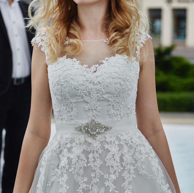 na sprzedaż posiadam suknię ślubną w kolorze ivory kupioną w salonie Nicole w Poznaniu. Jest to model Sposabella Aspazja 1433 ze zjawiskowym trenem szyta na wzrost ok 175 cm plus 6 obcas. Góra, ramiona, plecy wyszyte piękną koronką, dół również ozdobiony hiszpańską koronką. Tył pleców bardzo ozdobny zapinany na guziczki. Ma w talii pasek z zakładek tiulowych, na których naszyta jest z przodu aplikacja. Suknia jest zwiewna, lekka, dzięki tiulowemu, warstwowemu dołowi, jest efektowna - przepiękny tren podpinany na haftki przy każdej warstwie (wykonane na życzenie w salonie).