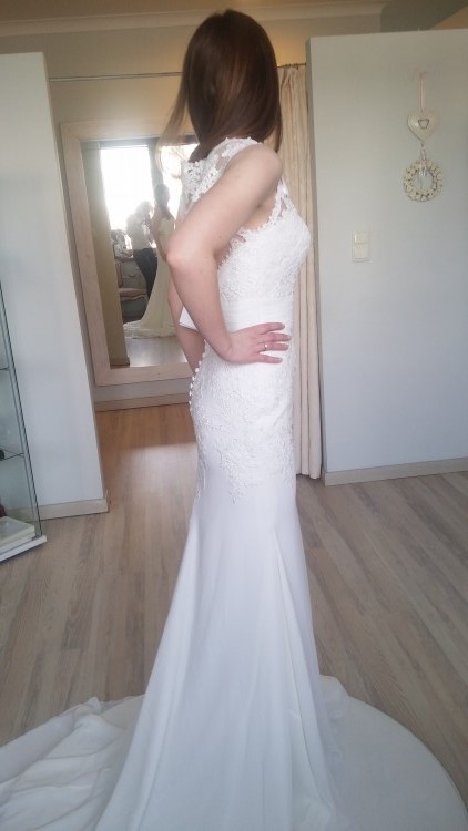 Suknia sprowadzana na zamówienie od wiodącego, światowego producenta Pronovias (cena katalogowa 6300zł). Materiał wysokiej jakości, kolor off white, koronka przylegająca bezpośrednio do skóry (bez tzw. siateczki/ pończochy - najczęściej wykorzystywanego rozwiązania mocowania koronki). Dla lepszego komfortu, w biuście zostały wszyte dwie cieliste miseczki (rozmiar B). Suknia oprócz standardowego zapięcia z tyłu na zamek + kilka guziczków posiada dodatkowe, trzy "mocowania" na haftki, dzięki czemu materiał nie marszczy się i nie przesuwa podczas ruchu.