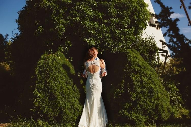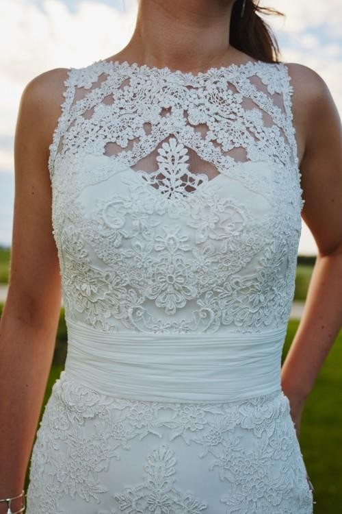 Suknia sprowadzana na zamówienie od wiodącego, światowego producenta Pronovias (cena katalogowa 6300zł). Materiał wysokiej jakości, kolor off white, koronka przylegająca bezpośrednio do skóry (bez tzw. siateczki/ pończochy - najczęściej wykorzystywanego rozwiązania mocowania koronki). Dla lepszego komfortu, w biuście zostały wszyte dwie cieliste miseczki (rozmiar B). Suknia oprócz standardowego zapięcia z tyłu na zamek + kilka guziczków posiada dodatkowe, trzy "mocowania" na haftki, dzięki czemu materiał nie marszczy się i nie przesuwa podczas ruchu.