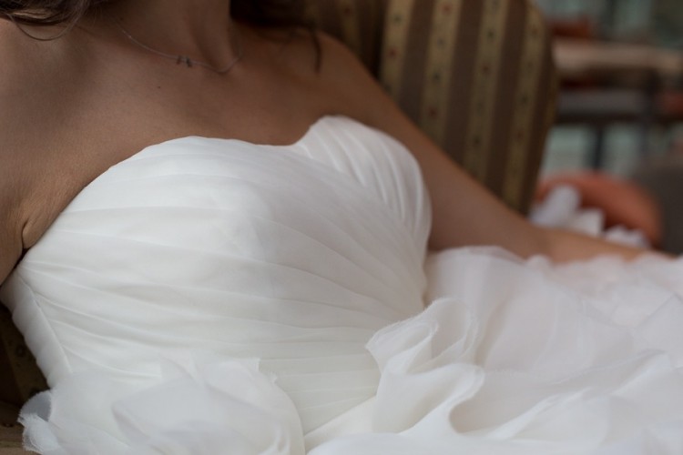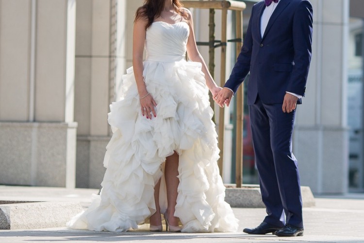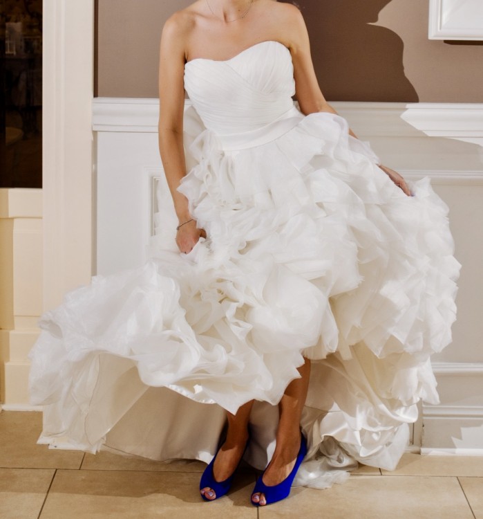 Diane Legrand, z salonu Madonna w Warszawie. Przód sukni jest podwinięty - ale bez problemu można z niej zrobić długą suknię z przodu. Suknia jest zwiewna, lekka, przeurocza, super wygodna i naprawdę robi świetne wrażenie :-) Suknia na dziewczynę ok. 170 cm wzrostu (plus obcas). Tren do podpięcia. Zapinana na zamek plus sznurowane wstążeczki. Do gorsetu doszyte usztywniacze na biust. Suknia założona w dniu ślubu oraz podczas sesji - następnie profesjonalnie wyczyszczona w salonie Madonna. Do sukni dodaję tiulowy prosty biały szal, nieużywany (było jednak za gorąco) - długość 2,70 m.