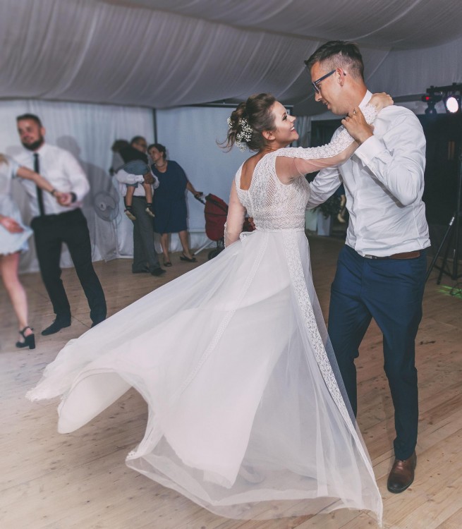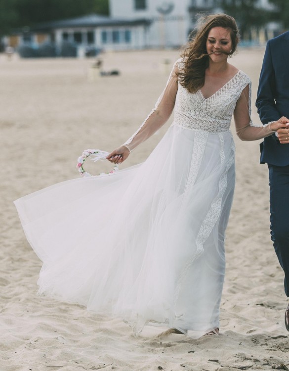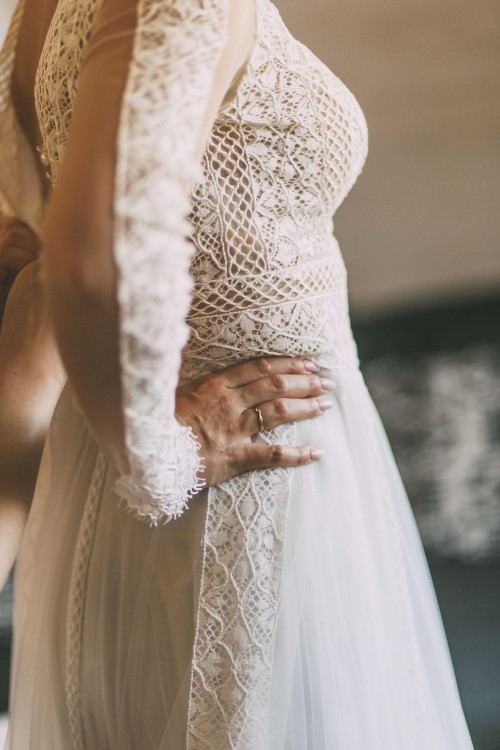 Suknia posiada dwie warstwy - pod spodem delikatny materiał z wycięciem do uda (po prawej stronie), a na górze miękka siateczka z ozdobnymi pasami koronki. Zapinana na guziki. Rękawy wykonane z przezroczystej siateczki z naszytą koronką (a'la tatuaż). Dekolt i plecy wycięte, jednak nie za mocno. Na dekolcie dodatkowa warstwa siateczki, która trzyma go w ryzach. Suknia jest niesamowicie lekka i wygodna, a do tego fantastycznie układa się w tańcu. Unikatowy model idealnie wpasowuje się w plenerowe letnie wesele.