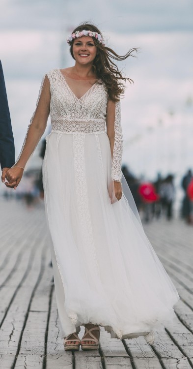 Przepiękna i nietypowa suknia Julii Gastoł - Sol - z drobnymi modyfikacjami oryginalnego modelu. Suknia jest lekka i zwiewna w stylu boho, idealna na letnie wesele. Do oryginału został dodany długi rękaw oraz dodatkowe paski koronki przy dekolcie. Kolor śmietankowy/ecru. Model typu „litera A”, czyli dopasowana góra, rozszerzająca się ku dołowi.