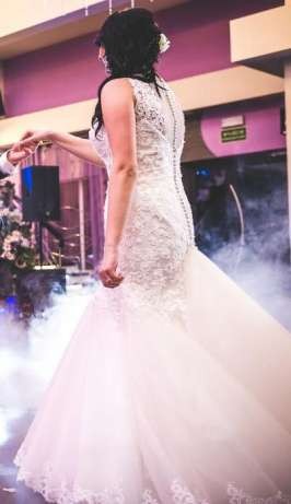 Sprzedam piękną suknię ślubną Lilian West 6315. Suknia w stylu syreny, francuska koronka z pięknym dekoltem w łódkę, tiulowy dół sukni, plecy zakryte delikatnym tiulem, guziczki obszyte tkaniną maskują suwak, kolor- śmietankowy. Rozmiar sukni to 38/40/42, wzrost 175 plus 9cm obcas. Suknia jest w stanie idealnym, założona tylko w dniu ślubu, wyczyszczona. Jest bardzo wygodna, nie krępuje ruchów, a piękna francuska koronka całościowo robi ogromne wrażenie.