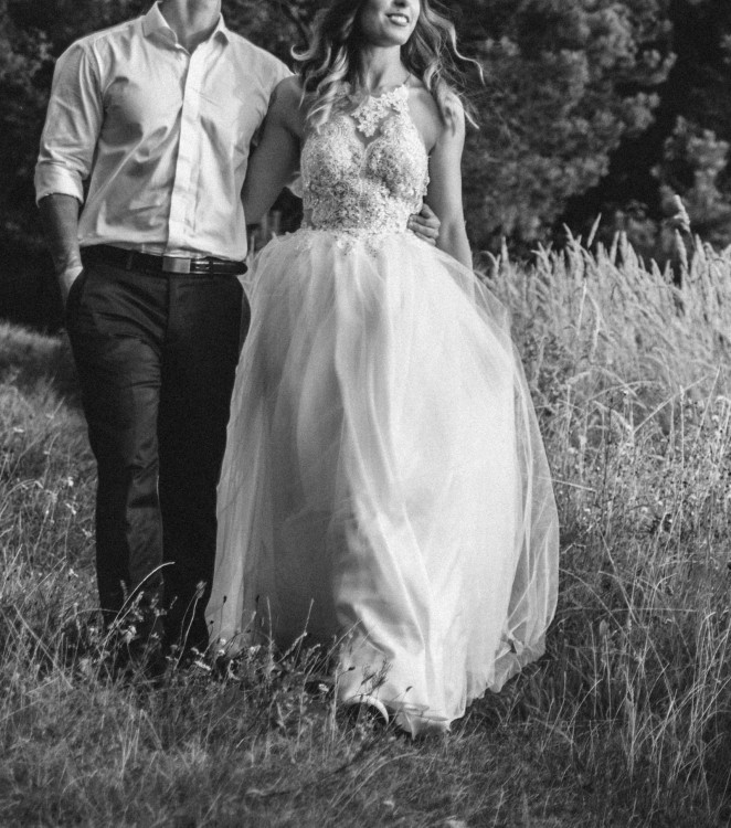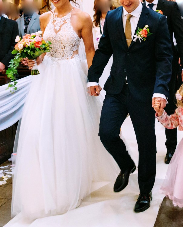 Suknia wyróżnia się nietypowym krojem i była szyta na zamówienie u świetnej krawcowej - specjalizującej się w sukniach ślubnych. Góra jest dopasowana, ramiączka można wydłużyć lub skrócić. Wąski dekolt ładnie odsłania ramiona i plecy. Dół sukni z tyłu jest delikatnie dłuższy, ma od spodu grubszy materiał - tak, aby tiul nie wchodził między nogi. Suknia jest lekka, wygodna i bardzo efektownie wygląda w tańcu. Całość jest w kolorze ivory. Jej stan jest dobry. Góra sukni w stanie idealnym, trzeba jedynie wymienić wierzchnie warstwy tiulu spódnicy, ponieważ Panie zostawiły pamiątkę po swoich obcasach..