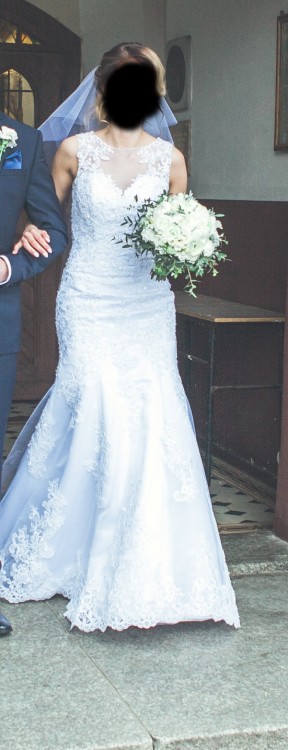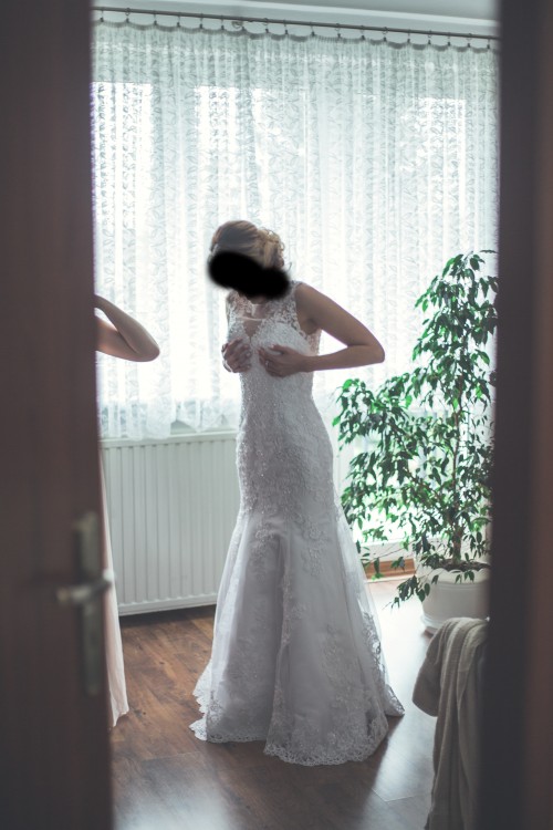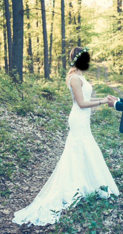 Witam. Sprzedam zjawiskową suknie ślubną. Suknia ślubna o fasonie syreny, wykonana z koronki. Model posiada tzw. dekolt illusion. Na plecach głęboki dekolt, zabudowany dodatkowo delikatną siateczka i wykończony koronkową aplikacją na bokach, na koronce są małe diamenciki i kryształki. Tył sukni jest częściowo zapinany na zamek i ozdobne guziczki, tren o długości 0,5 m. Tren jest z samej koronki, jest on podpinany, nie przeszkadza w tańcu czy chodzeniu. Szyta była na 165 cm + 6 cm obcas. Jest możliwość włożenia koła w halkę. Do sukni dodaje welon krótki do łopatek(szkoda pięknych ozdobnych pleców). Kontakt jedynie @ - dorotaflorczyk05@gmail.com
