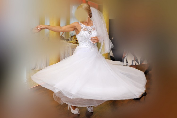 Dół składający się z 6 warstw prześwitujących i dodatkowo 2 warstwy podszewki. Samo to się pięknie kloszuje. Natomiast ja miałam dodatkowo jeszcze bardzo bufiastą halkę na sztywnym kole. Raz było włożone, raz wyciągnięte - jak wymagała sytuacja :) Halka także wyprana, dodatkowo nasączona krochmalem, co uczyniło ją jeszcze sztywniejszą.