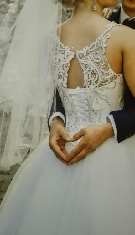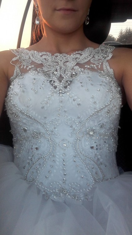 Góra sukni jak z bajki; bogato zdobiona koralikami, perełkami, kryształkami z mnóstwem haftów. Wykonana na wiązanym gorsecie z wycięciem w kształcie serca. Przykryta jakby siateczką przysłaniającą dekolt. Bez rękawów. Tył tworzą jakby skrzydła motyla.