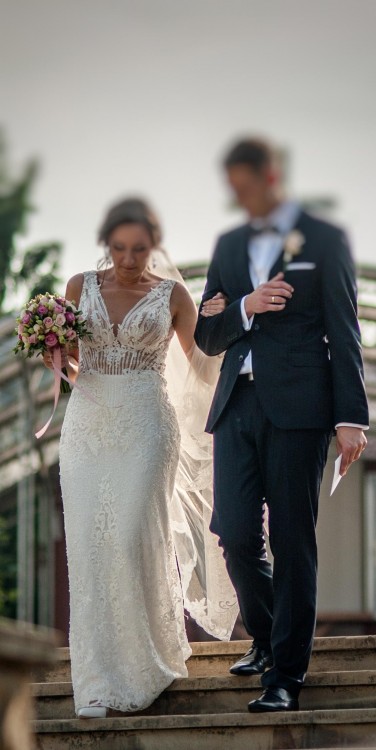 Dekolt w literę „V” wydłuży Twoją sylwetkę, a ułożenie wzoru podkreśli talię oraz delikatnie oplecie biodra. Tył sukni zmysłowo odsłania plecy – to jest zdecydowane „must have”! Tren jest zaś szalenie efektowny, a rozcięcie z tyłu sprawia, że taniec w niej będzie dla Ciebie przyjemnością!