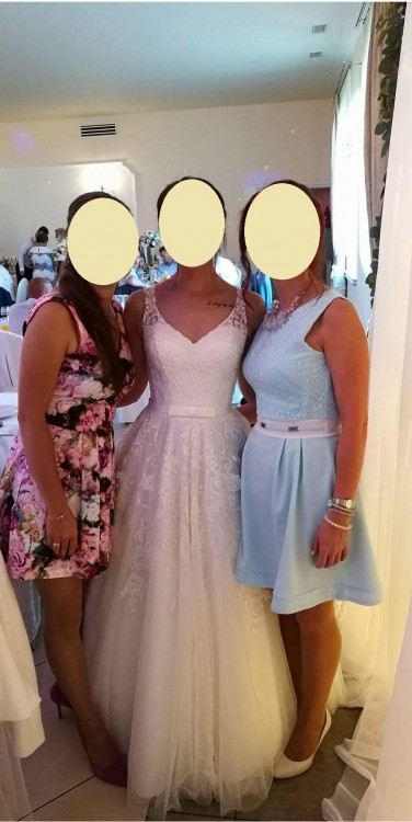 Góra sukni oraz część spódnicy obszyte delikatną koronką z cekinami, które pięknie się mienią (niestety nie widać na zdjęciach), w pasie wszyty satynowy pasek z kokardką - pięknie podkreśla talię.