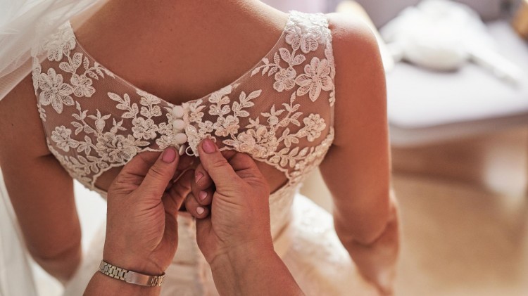 Cała suknia zapinana na zameczek i haftkę (ukryte pod rzędem guziczków). Idealnie dopasowana do ciała podkreśla talię i eksponuje dekold.
