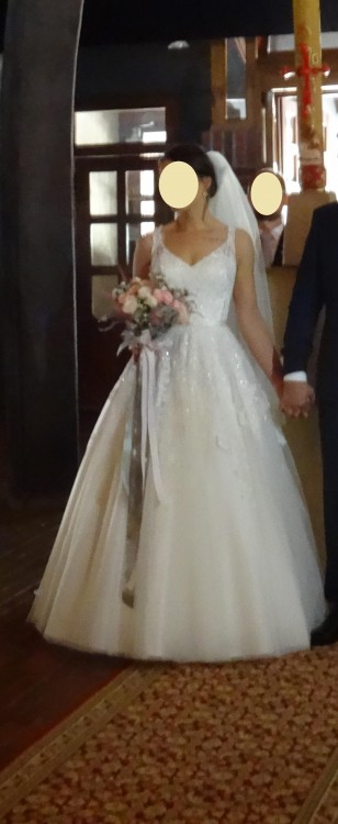 Suknia w bardzo dobrym stanie, jest wyczyszczona chemicznie - gotowa do użycia; przemiłe Panie z salonu Ksymena zgadzaja się na wykonanie ewentualnych przeróbek.