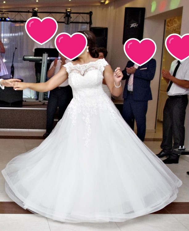 Górę sukni zdobi dekolt wycięty w kształt serduszka, subtelnie zakryty przez piękne elementy szlachetnej, ręcznie wszywanej koronki, które opływają na ramiona( wszyte zostały gumki ułatwiające poruszanie się w tańcu) oraz na spódnicę. Spódnica sukni nie posiada koła, uszyta jest z 7 warstw materiału. Górne warstwy opiewają w miękki, jedwabny tiul na dole obszyty krynoliną, co potęguje piękne ułożenie sukni. Mimo wielu warstw suknia jest niezwykle wygodna. Naturalnie, zwiewnie i bajecznie układa się w tańcu. Zapinana jest na zasuwak, ukryty pod rzędem guziczków.