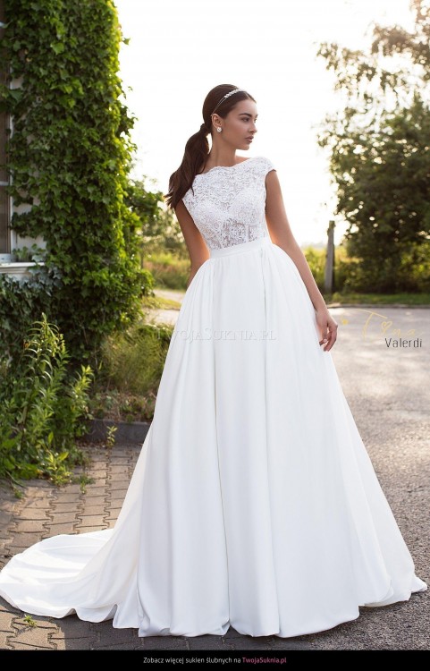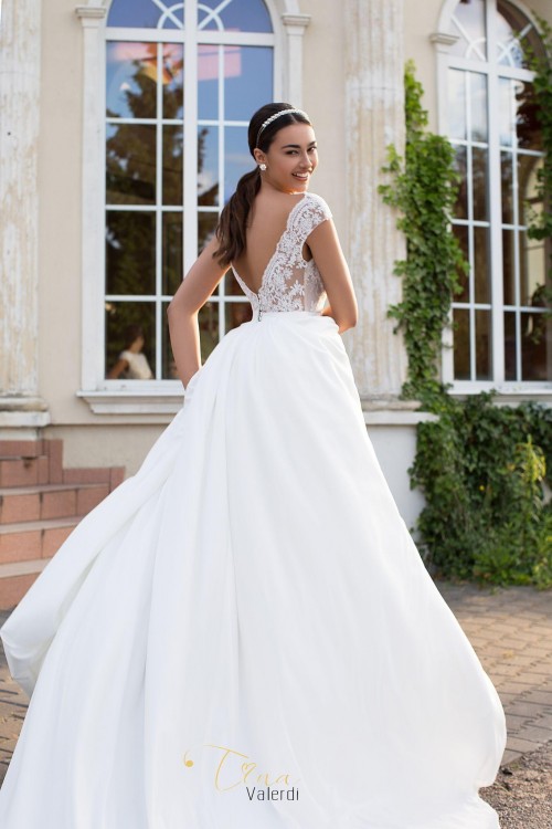 Góra sukni wykonana z wysokiej jakości gipiury, usztywnienie przy biuście, tył w literę V zapinany na subtelne guziczki, dół sukni wykonany jest z atłasowej tkaniny pod która wszyte są halki typu push-up. Suknia posiada przepiękny tren który nadaje sukni klasy i elegancji istnieje możliwość podpięcie go na tasiemki.