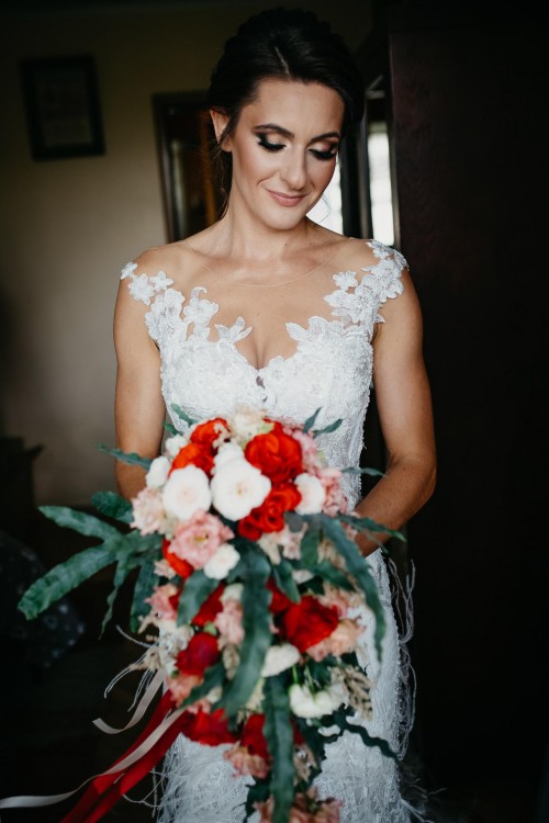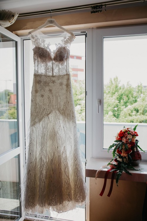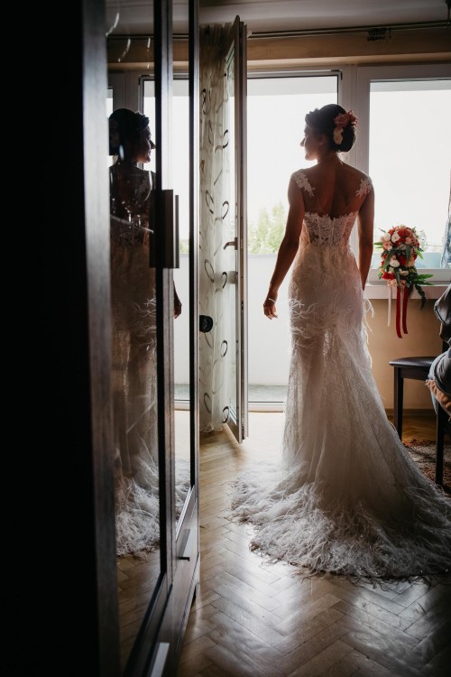 Nie zamieniłabym jej na żadną inną, leży perfekcyjnie, dopracowana w każdym calu. Koronki i pióra ręcznie przyszywane, cała produkcja w Koninie u nas w Polsce. Suknia już po praniu ręcznym w salonie ślubnym, nie ma żadnych uszkodzeń ani zabrudzeń.