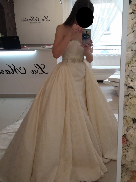 Materiał z którego jest wykonana posiada piękny kwiatowy/ornamentowy wzór, niedominujący jednak kreacji. Suknia robi ogromne wrażenie. Jest niespotykana i wyróżnia się na tle wszechobecnych koronek i tiuli. Zdecydowanie dla odważnych Pań, które chcą wyglądać zjawiskowo, ale z klasą.