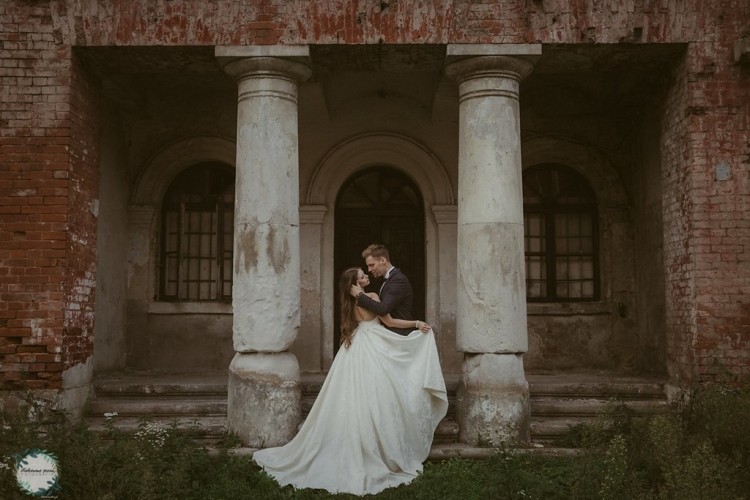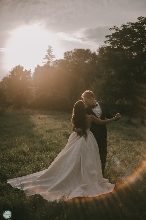 1. Syrenki z dekoltem w serce wyszywanym kamieniami i perełkami, na górze warstwa cielistej siateczki podtrzymującej (opcjonalnie można ją obciąć). Nisko wycięty tył pięknie prezentuje plecy. Dół delikatnie poszerzany nie krępuje ruchów w tańcu.