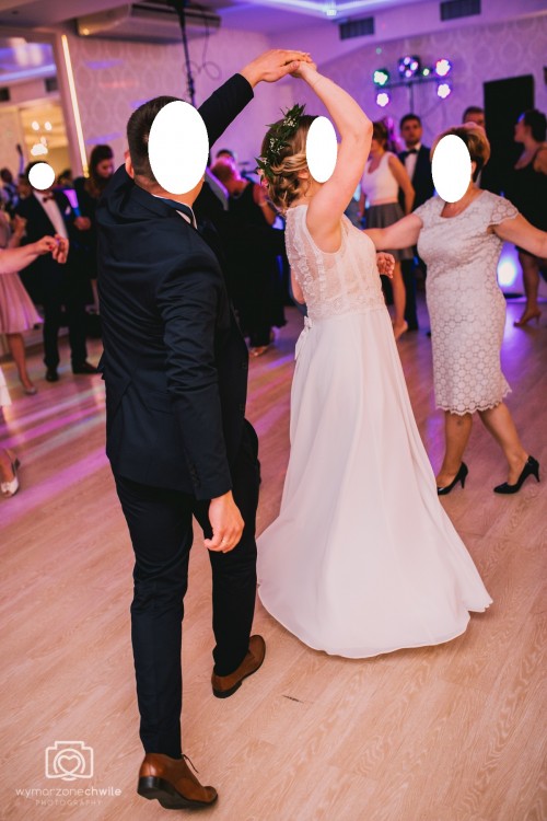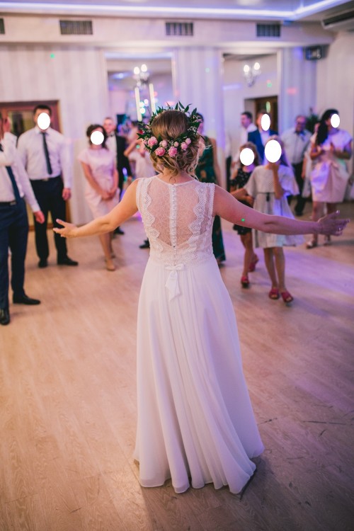 Delikatna, zwiewna i oryginalna suknia w kolorze ivory. Dół bez koła.