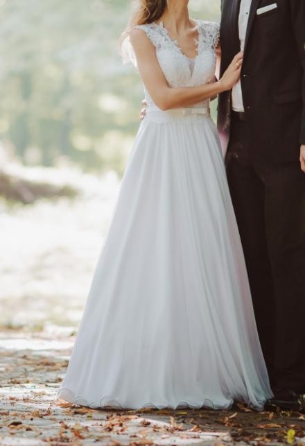 Góra pięknie zdobiona koronka. Do sukni spokojnie mozna zalozyc biustonosz i czuc sie naprawde komfortowo. Z tyłu zapinana na zamek i dodatkowo wiazana (mozna nie wiazac tasiemka i zasunac jedynie na zamek – kwestia gustu). Muślinowy dół uklada sie pieknie podczas tanca, jest delikatny i lekki.