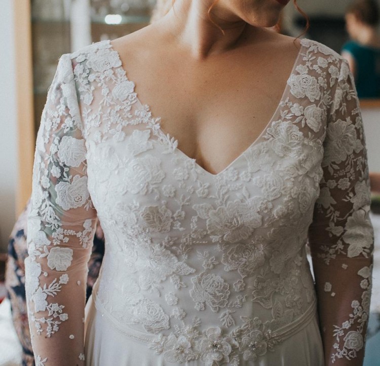 Rękawy długości 7/8 z gipiury, górna część gęściej obszyta haftem, coraz rzadszy wzór w kierunku dłoni.