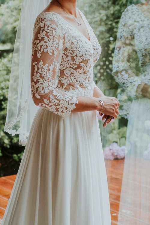 Zwiewna suknia ślubna z koronkową górą! Tren i welon gratis!