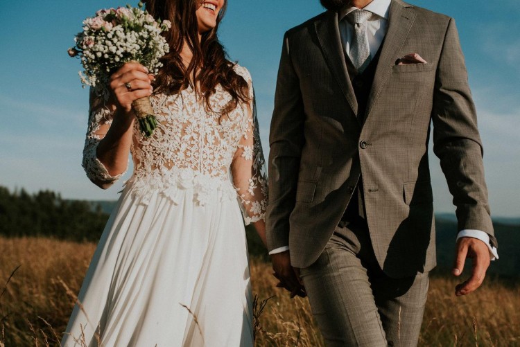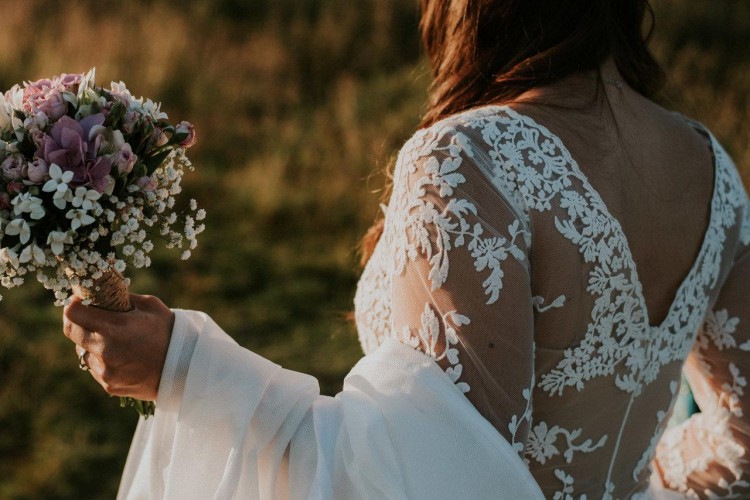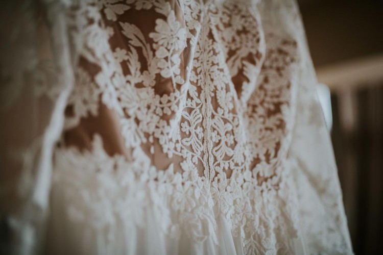 Góra sukienki jest wykonana z pięknej koronki, którą jest również obszyty welon.